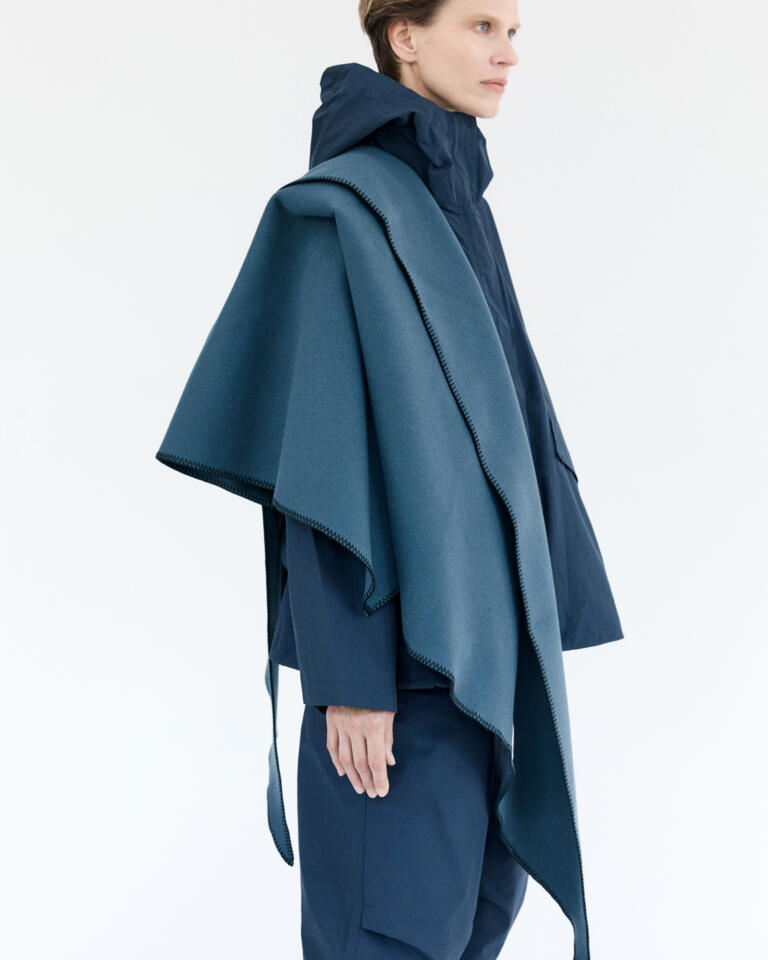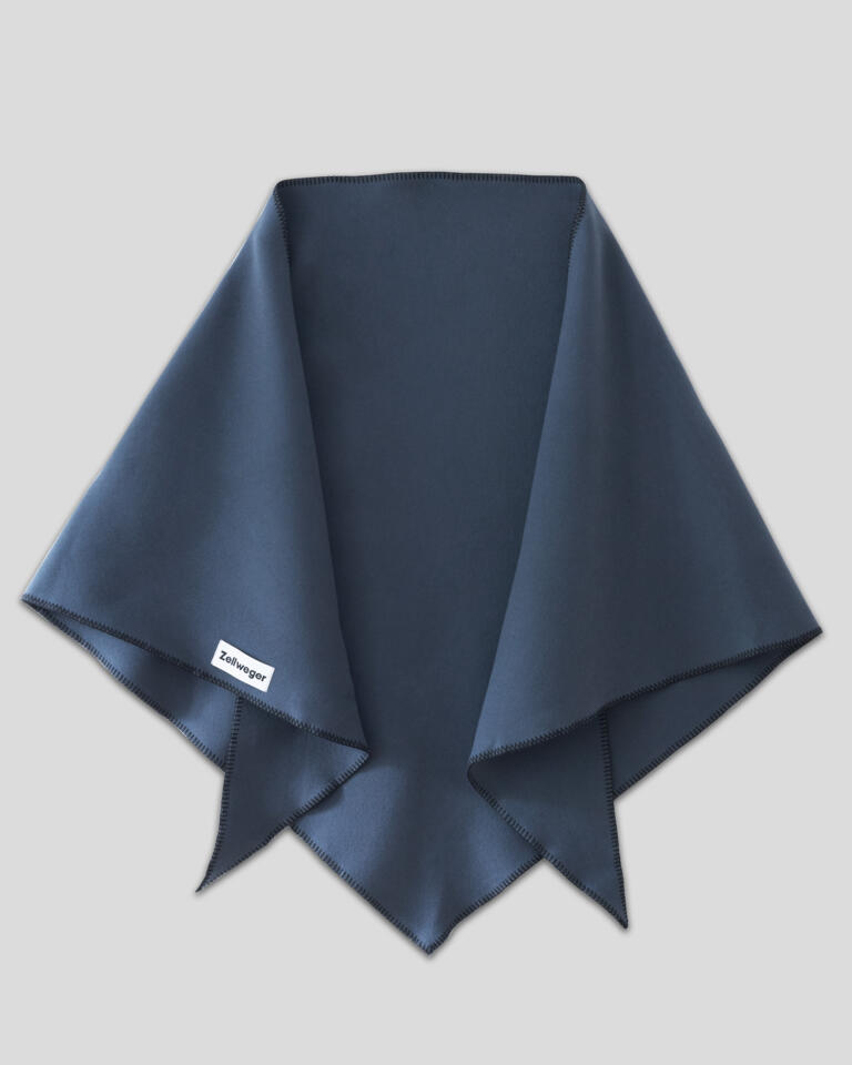 The Grand Wrap, an oversized version of our classic Wrap, offers perfect dimensions for wrapping around the neck or draping over the shoulder as a chic cape. Crafted from 100% cashmere in a sophisticated Dusk Blue, it features matching overlock stitching for added elegance and durability.