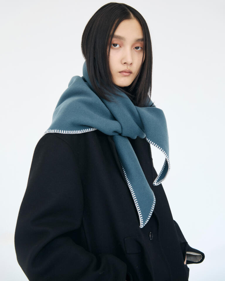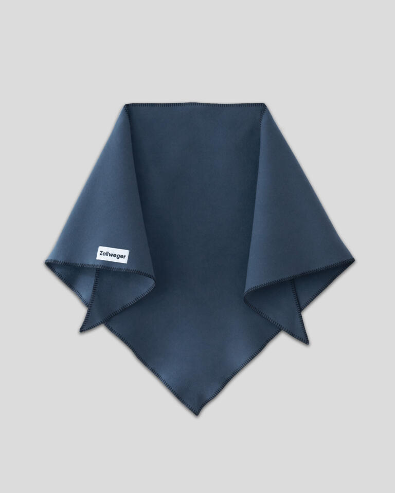 As a triangle, The Wrap has the ideal dimensions to be wrapped around the neck or worn as a cape over the shoulder. Made of 100% cashmere and in classic Dusk Blue with a matching overlock stitching.